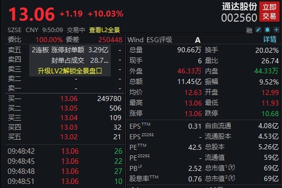河南板块中,通达股份表现亮眼,开盘快速拉升至涨停连收3个涨停板,股价创近期新高,报13.06元/股,封单金额为3.29亿元,总市值为69亿元。